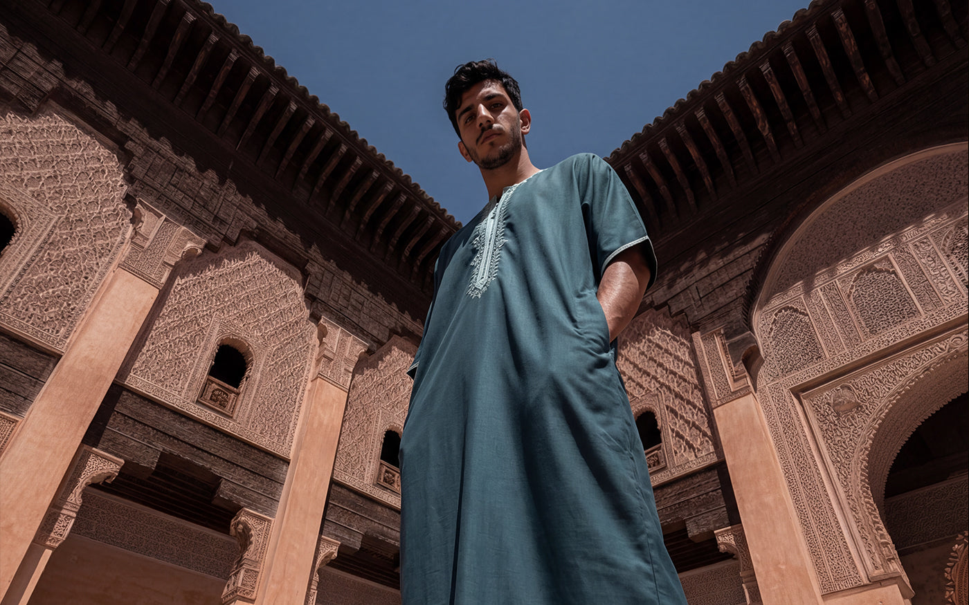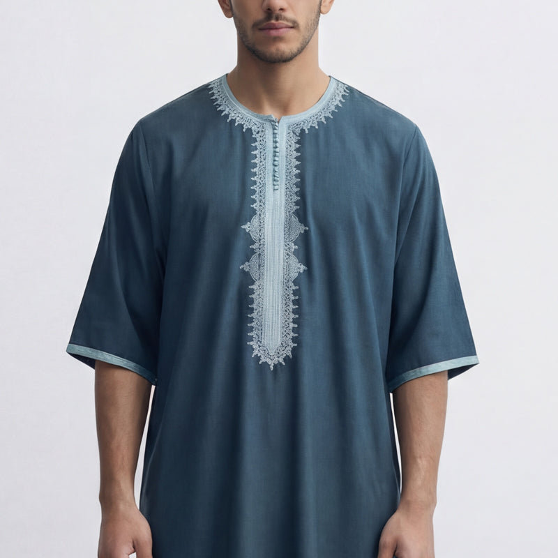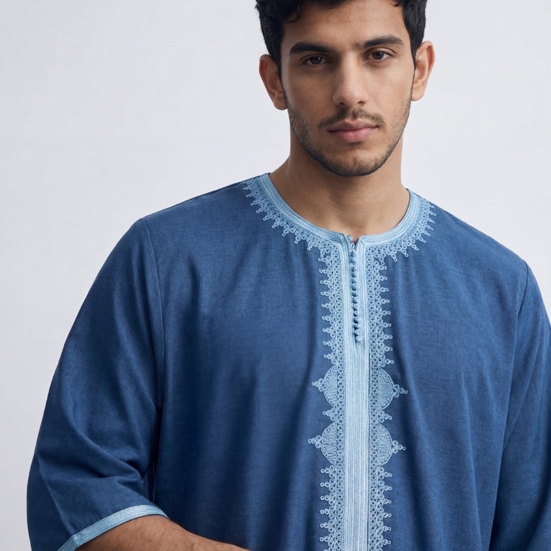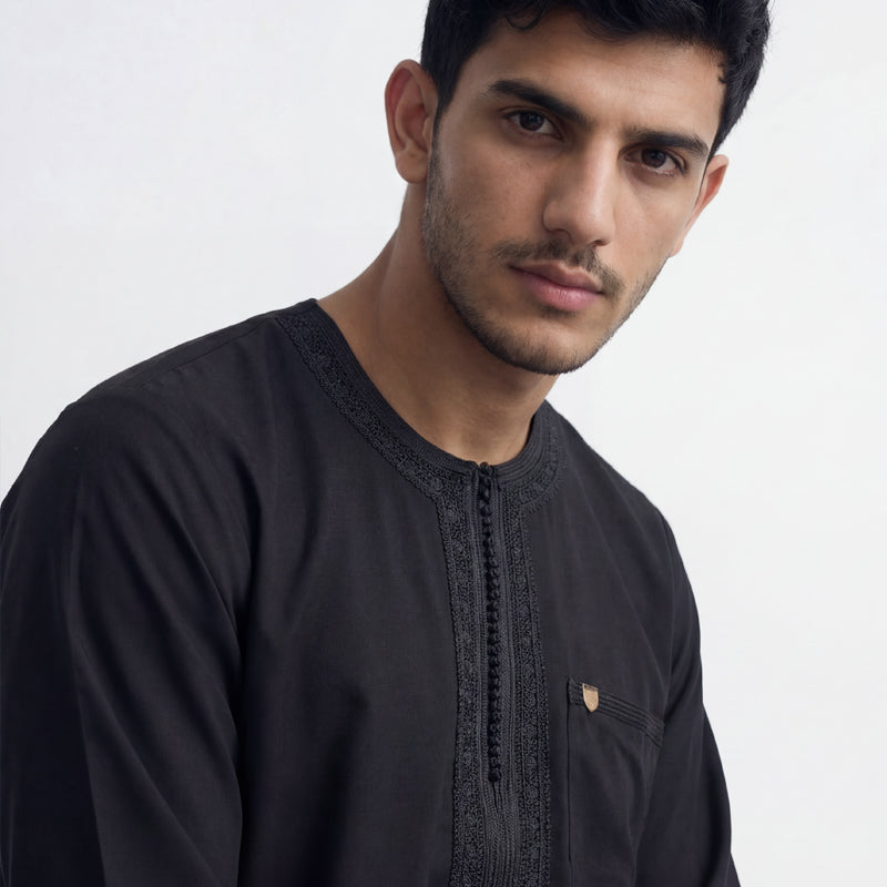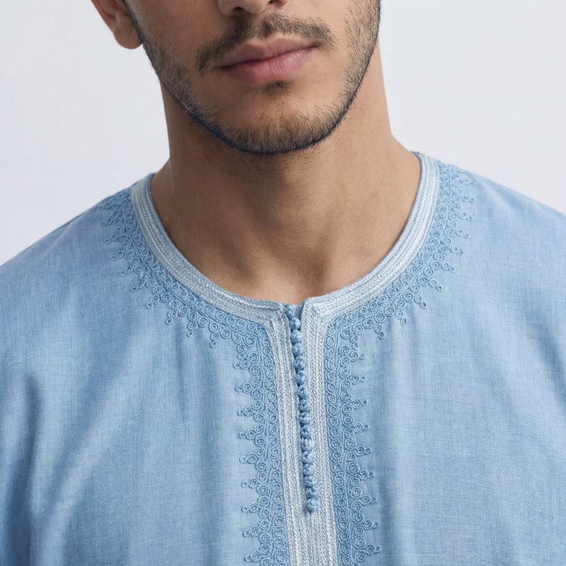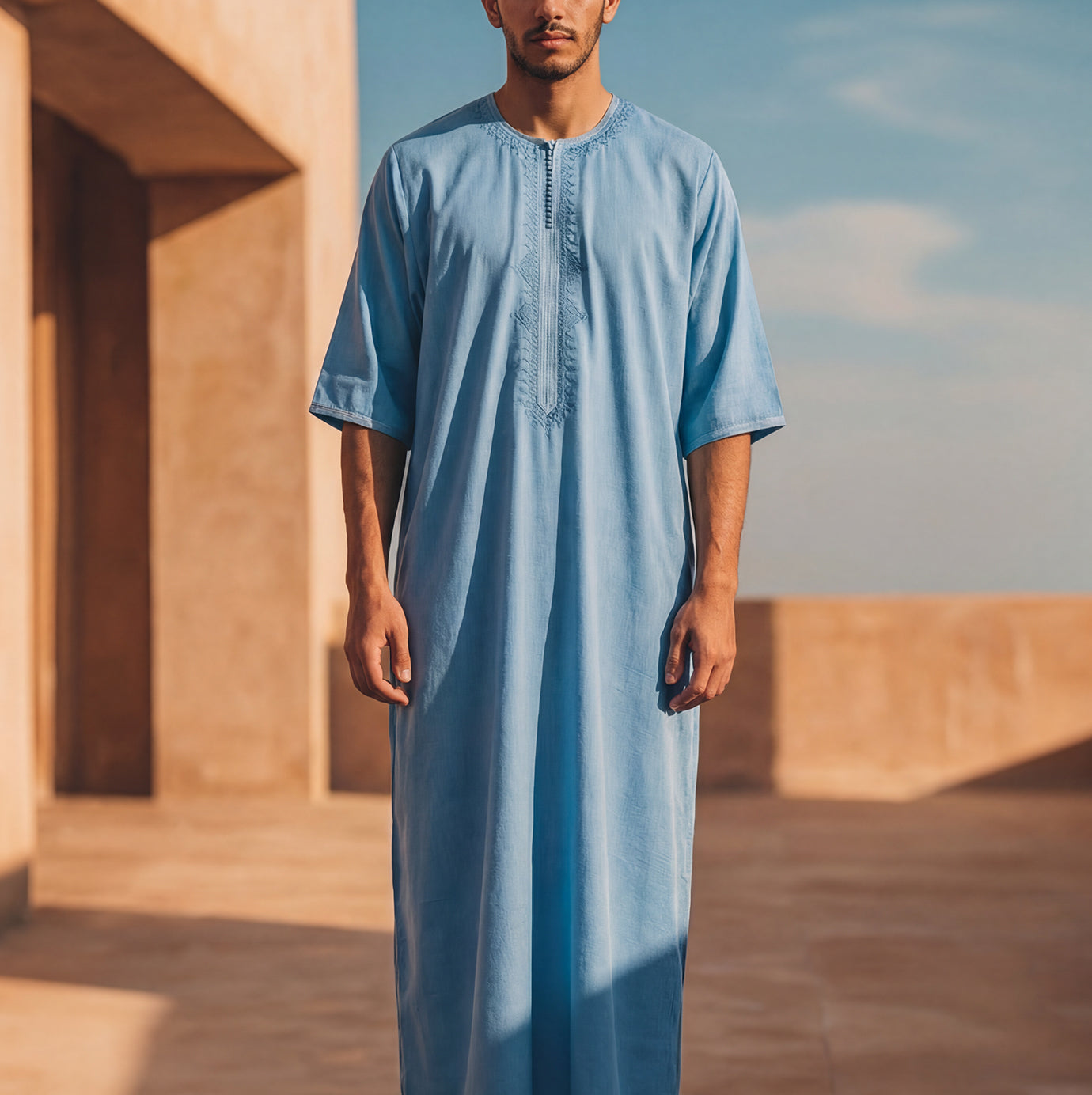 Our collections include Moroccan thobes, collared thobes, short sleeve thobes, and hijab essentials—crafted with clean lines, refined embroidery, and a timeless aesthetic.